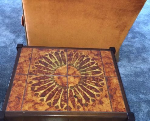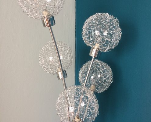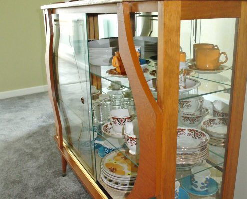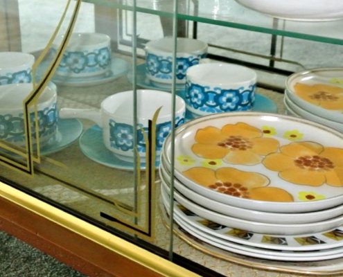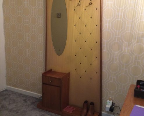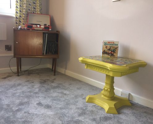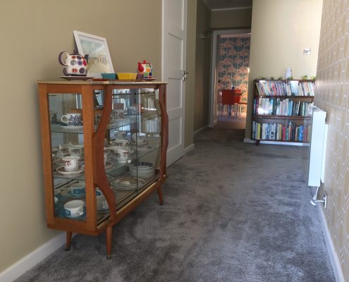 The hallways in Tobago are weirdly wide – we are always bowled over by how spacious this flat feels. Lushly carpeted in our sea grey flooring, the hallway is home to our bookcase, our lovely glass-fronted 60s crockery cabinet, wall and ceiling lighting, and our awesome and completely bonkers yellow hallstand – one of my all-time favourite auction finds – for your coats, hats, shoes, umbrellas and bowler hat, should you be so inclined. There is a handy console table for your keys, too, so no need to schlep miles to put down all your belongings.