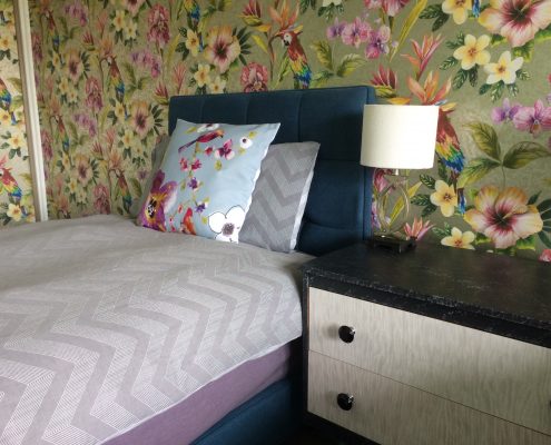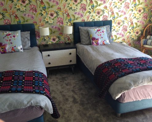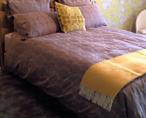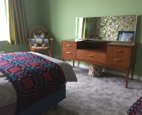 WWhat’s our favourite thing about this room? The flamboyant yellow and grey wallpaper? The yellow and grey welsh blanket cushion? Or maybe it’s the 1970s Sanderson fabric curtains made by my mum – they graced the living room of my childhood for years (“That fabric cost a bomb” she shudders, still in shock). Whatever it is that piques your fancy, this room is a serene and peaceful haven, so sink into the Hypnos kingsize bed, and look forward to a wonderfully refreshing night’s sleep.