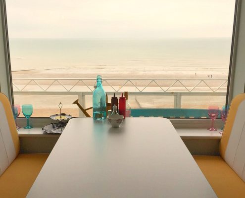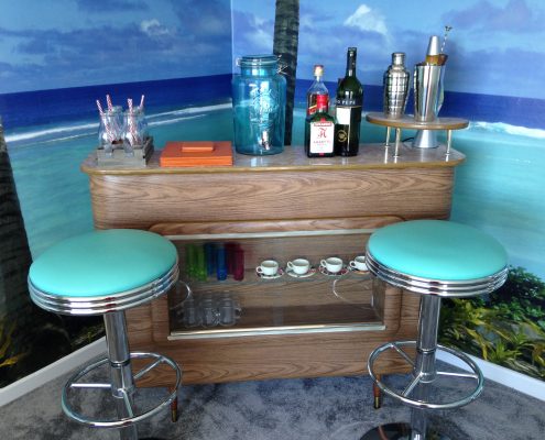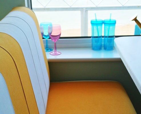 Diner style seating for 6 overlooking that magnificent view, equipped with old skool squeezy ketchup and vinegar bottles, and mock schoolmilk-bottle water glasses mean even a bought fish-and-chip supper is more fun than you can shake a stick at. The cocktail bar and bar-stools mean you can play at making cocktails (try our Tobago signature tipple – orange juice and amaretto on ice), all with the beach mural wallpaper as your backdrop. With the industrial restaurant-style 8-arm ‘spider’ lighting and access to seating area on the balcony, this Diner is huge fun to spend time in. Dress up for dinner every evening and make a meal of it.