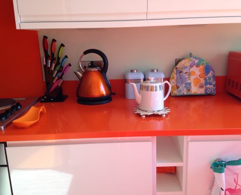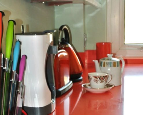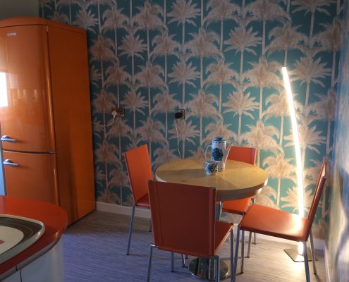 You never knew it, but you love orange quartz worktop. That and the retro orange fridge-freezer arm in arm with the exuberant palm tree wallpaper never fails to cheer you up. The worktop is a silly indulgence and does need a bit of looking after, we admit, but it’s so jolly you won’t mind. This is a well equipped kitchen for daily cooking and serving food, although not so much for entering bake-offs or masterminding sushi. There is a dishwasher, microwave, kettle, toaster, and Dolce Gusto coffeemaker but no washing machine, and there is a seating area for 4 people. A lovely view out to the West makes washing up (almost) a pleasure.