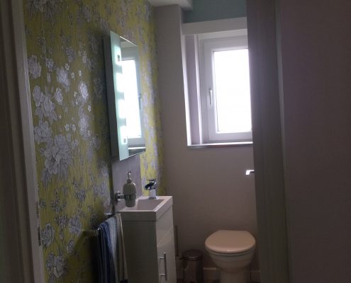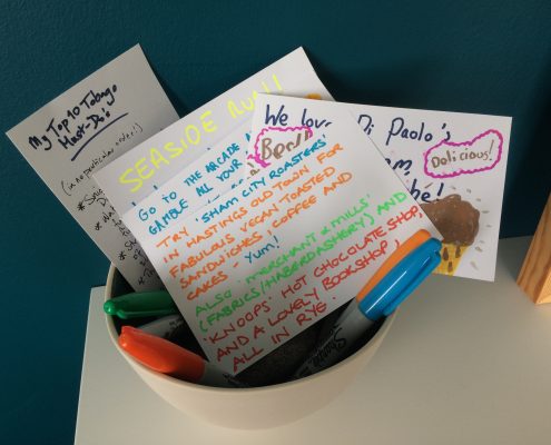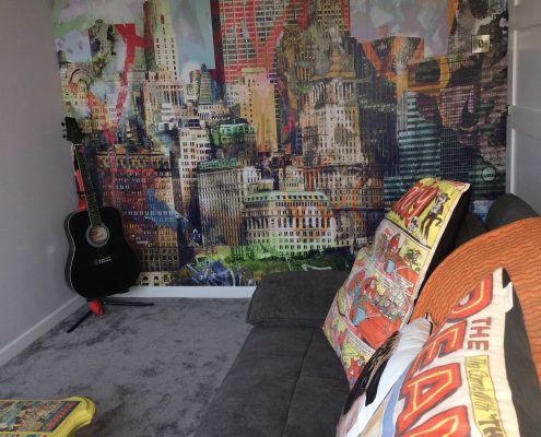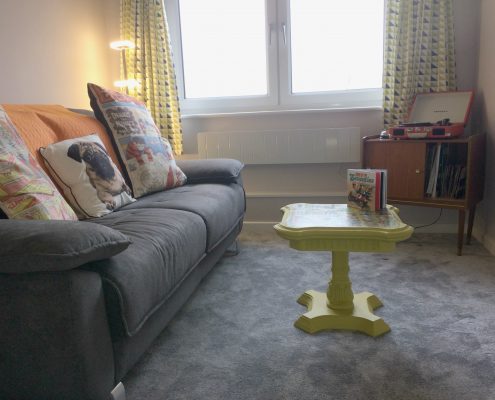 We call it the Games Room, but you could call it the Third Bedroom, the Den, the Record Room, or the Pug room. Because yes, of course there’s a pug cushion. The super-easy-to-use sofabed is a true double, so this room can house a couple, but for most families this might best serve your teenager. The funky New York grafitti wallpaper is a brilliant backdrop to the cute vintage record cabinet, containing vintage cheese – ‘Now That’s What I Call Music 6′, anyone?! I know, the kids’ jaws will drop. They’ll be like OMG were you even alive then. There’s a second TV in here, Freeview only (but bring your Firestick if you fancy), so if The Sewing Bee clashes with some form of ball-related televisual viewing, this room is your friend; banish the others to the 55″ eye-ruining telly.