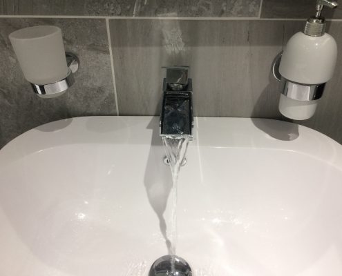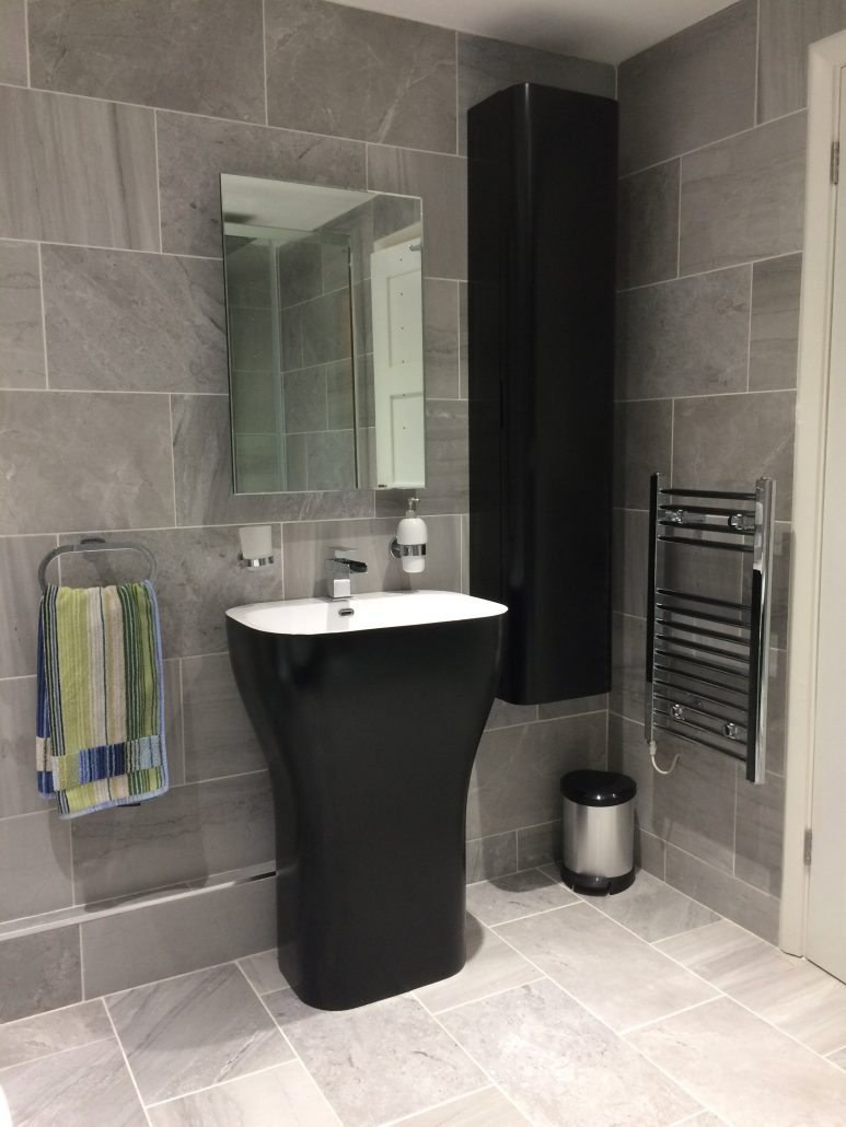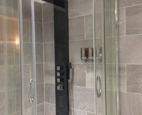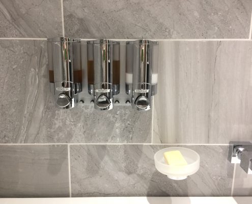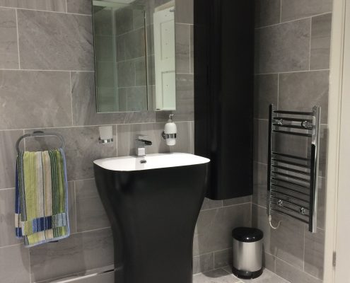 Spacious and surprisingly monotone (the husband went all minimalist), the bathroom is luxurious and calm. There is a very roomy double-door quadrant shower enclosure; the shower panel has multiple settings for overhead, handheld and body jets. A very stylish and roomy black cabinet will easily take all your stuff. Let the waterfall taps and lovely deep bath soothe your stresses away. Unusually for an apartment Tobago has a cloakroom as well as a bathroom, so no queues for the loo! Shampoo, conditioner, and body wash is complementary, as is handsoap in both the bathroom and the cloakroom.